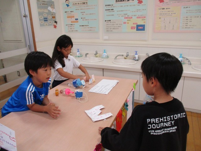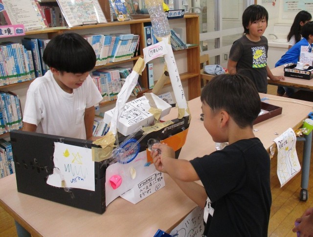 「おもちゃまつり」を控え、学級内で自分たちが製作したおもちゃを試してみました。「お店屋さん」「お客さん」の役割に分かれ、おもちゃを使って楽しめました。大盛り上がりでした!