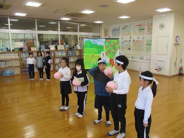 マイプラン学習で取り組んできた国語科単元「ニャーゴ」のまとめとして、物語を劇にして演じます。学んだことを生かして、各場面の「ニャーゴ!」の鳴き方がとても工夫されています。劇のお披露目に向けて、練習を頑張っています。