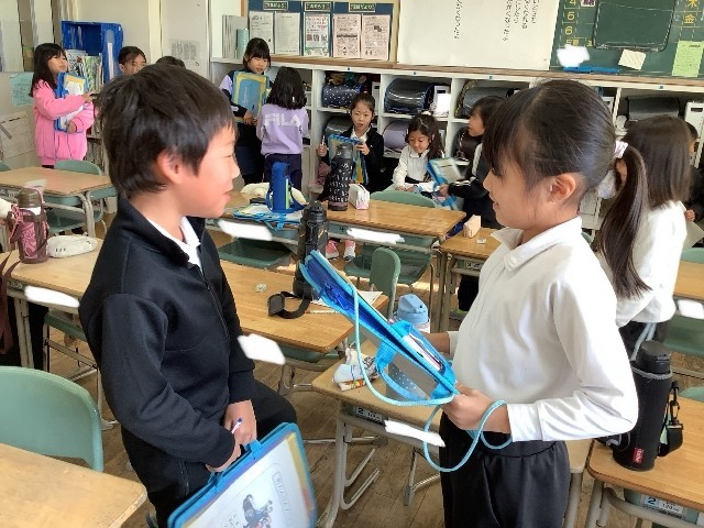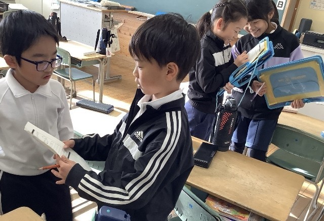 マイプラン学習での単元「ニャーゴ」の追究が進んでいます。自分の音読を聞いてもらったり、動画として撮影して検証したり、互いに情報交換をしたりしながら、各自でよりよい音読を追究しています。