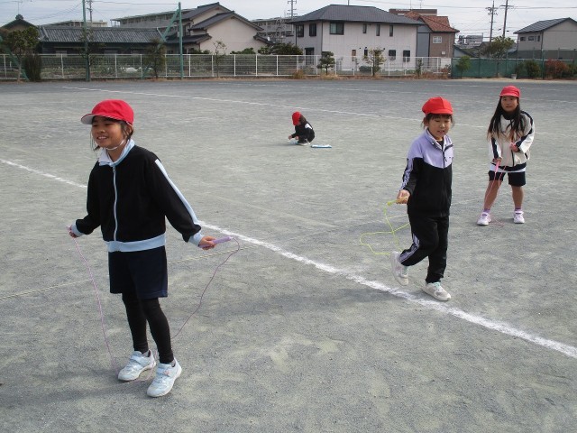 体育では、なわとびに取り組んでいます。個人の目標を決め、技を磨いています。あや跳びをリズムよく跳んだり、二重跳びを何回も跳んだりする子もいます。頑張って練習して、個人の記録を伸ばしていきましょう。