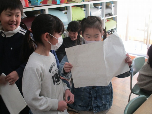 算数では、図形の単元を学習しています。厚紙を面で切り、それを組み立てて箱(直方体など)を作ります。試行錯誤しながら頑張っています。