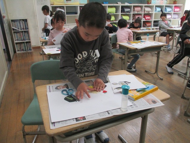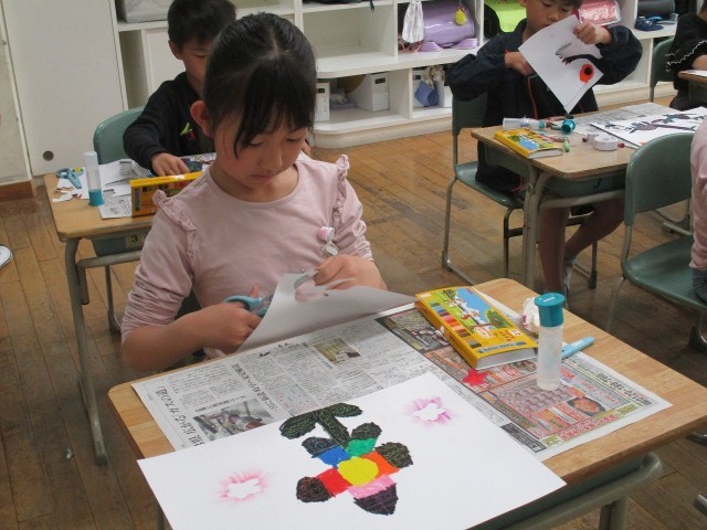 「海の生き物」をテーマに、カラー版画を制作しています。色とりどりの特殊な色紙を自由に切って貼り合わせて表現します。今は版画の台紙づくりを頑張っています。完成して刷るのが楽しみです。