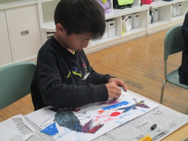 「学校らんど」「おかしらんど」「どうぶつらんど」…。クレヨンでいろいろな技法を使いながら、子どもたちは思い思いの自分の「ランド」を描きました。