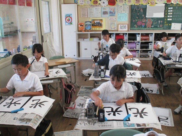 1学期における3年生毛筆のしめくくりは「日」という漢字です。二画目の「折れ」を意識して書くことを大切にしています。4月に初めて毛筆を始めたころに比べて、どの子も上手に筆を使って書けるようになっています。