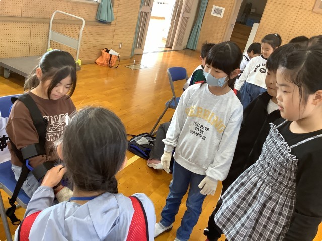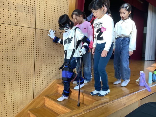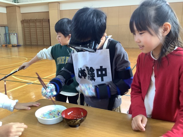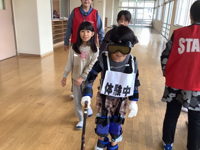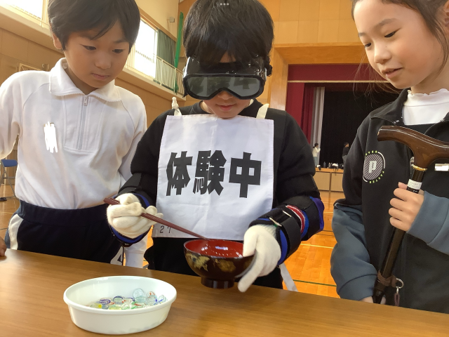 高齢者の視界や体の不自由さを再現するために、ゴーグルや器具、軍手をつけて体験しました。器具を装着すると、思うように歩けなかったり、手を動かすことができなかったりして、高齢者の体の大変さを学びました。これから高齢者の方を見かけたら、声をかけたり手伝ったりして、助けてあげられるとよいですね。