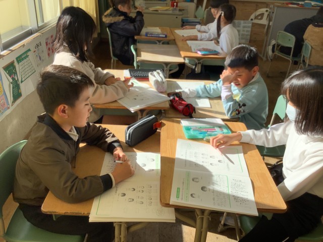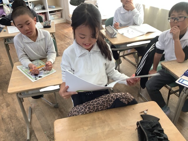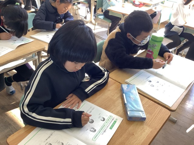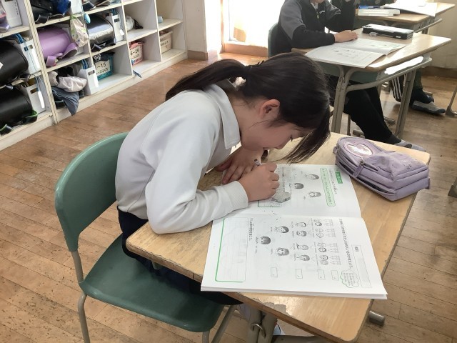 3・4時間目に点字についての授業がありました。点字の「あいうえお」を覚えたあとに、点字を見て何て読むかのクイズに取り組み、その後、自分の名前を点字器を使ってしおりに打ち込みました。作った点字を、視覚しょうがい者の方に指で読んでもらい、とてもうれしそうでした。点字について詳しく知り、点字を覚える大変さや、読める喜びを感じました。
