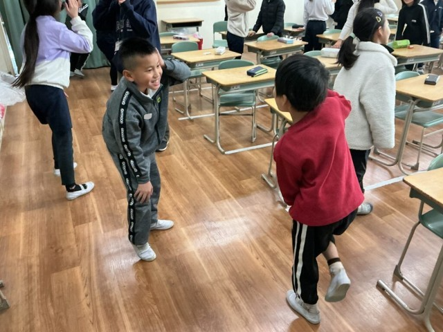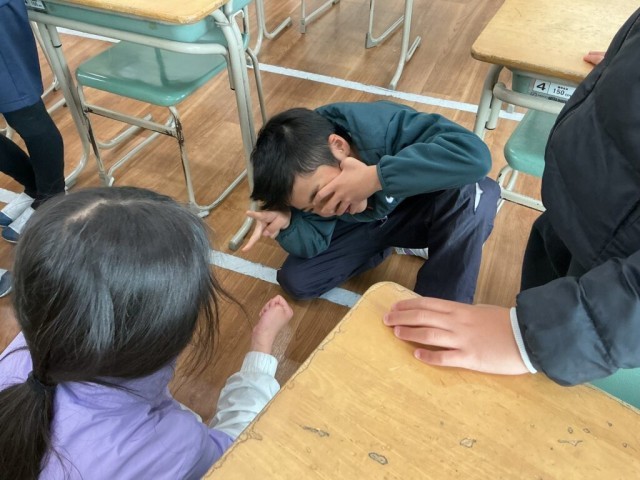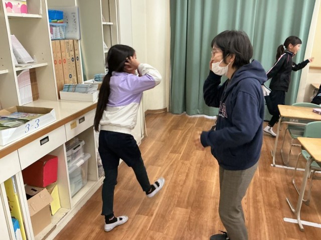 外国語活動の時間で「Head, shoulders, knees and toes」を歌いました。じゃんけんをして勝った子は「Touch your 〇〇.」と負けた子に言い、負けた子はその場所を押さえながら次の子とじゃんけんを繰り返します。負け続けると、動けなくなるくらい押さえるところが多くなり、勝った時に大喜びしながら繰り返しじゃんけんをしていました。