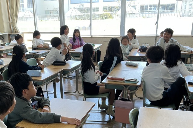 外国語活動の時間で「Head, shoulders, knees and toes」を歌いました。じゃんけんをして勝った子は「Touch your 〇〇.」と負けた子に言い、負けた子はその場所を押さえながら次の子とじゃんけんを繰り返します。負け続けると、動けなくなるくらい押さえるところが多くなり、勝った時に大喜びしながら繰り返しじゃんけんをしていました。