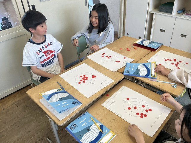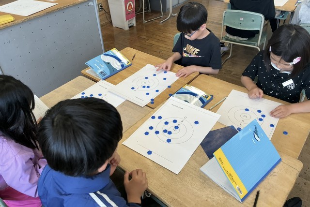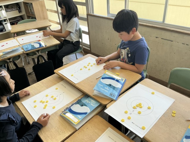 おはじき入れをして、入った個数と得点を表に書きました。得点を計算する際に、10や0のかけ算の方法を考えました。自分の考えを発表し、楽しみながら学習していました。