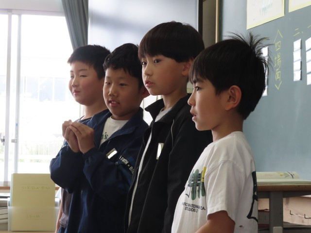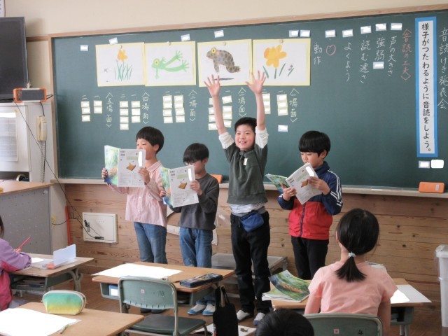 授業参観で、「すいせんのラッパ」の音読発表会を行いました。子どもたちは、物語の様子が伝わるように、声の大きさや強弱などを工夫しながら読むことができました。本日はご参観ありがとうございました。