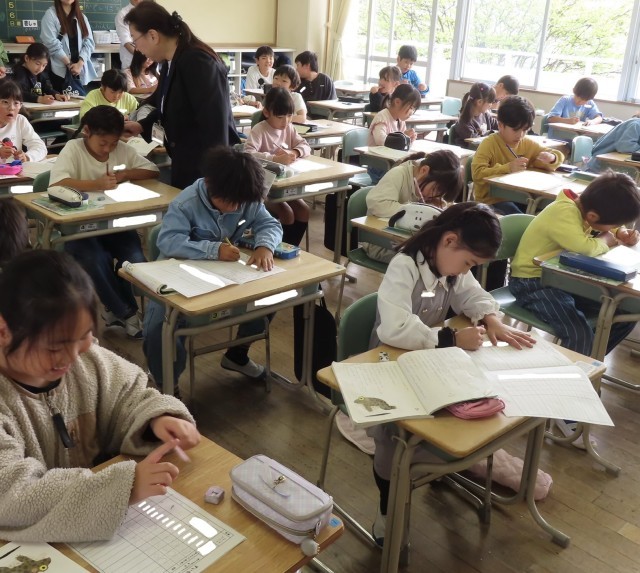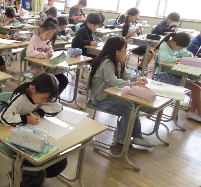 3年生になって初めての「ことば」の授業を行いました。本年度の担当は、教頭先生です。「星野富弘さん」という方の話を通して、字を丁寧に書けるように、練習を頑張ろうという意欲をもちました。その後、自分の名前をとても丁寧に、そして一生懸命書いていました。