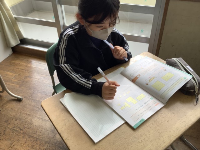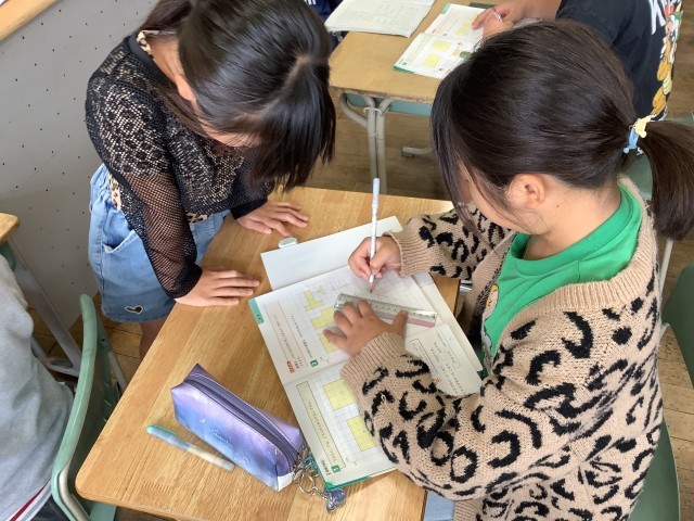 外国語では、筆箱の中身にある文房具を英語で伝え合いました。教科書から相手が選んだ文房具を英語で当てるクイズもしました。相手が選んだ文房具を当てようと難しい単語の発音にもチャレンジしながらも、実際に当てるのは難しかったようです。それでも、子どもたちは楽しそうに活動していました。