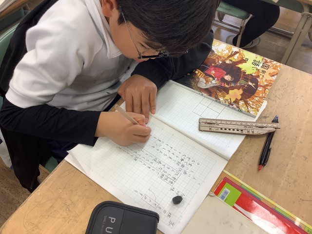 国語の単元「一つの花」では、物語文について学習しています。何度もくり返されえる言葉や、1場面と5場面で変化する情景描写などに着目して、自分で考えたい課題を設定しました。自分の考えたことが、最後にみんなで考える課題につながっていきます。集中して自分で学ぶ姿勢が育ってきています。