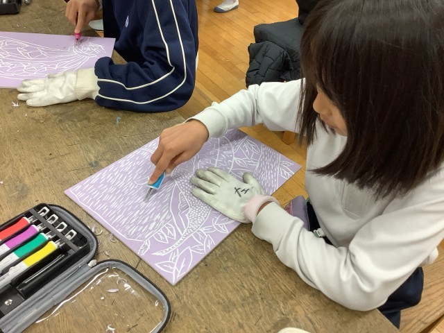 11/17 4年生 図画工作「彫刻刀で、昆虫を彫ったよ」
