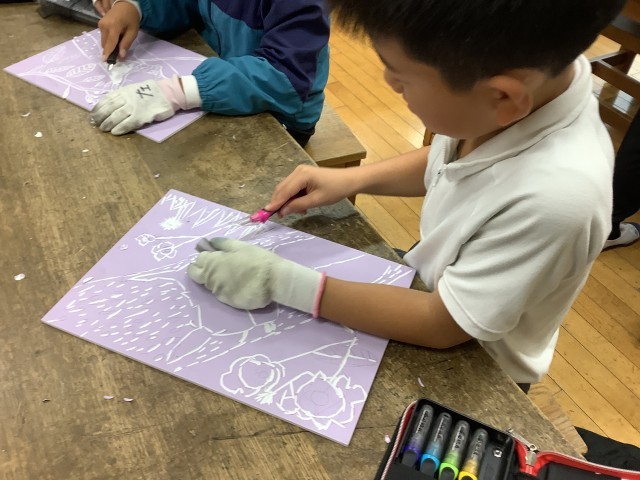 図画工作で、昆虫を題材にした版画を彫っています。下書きした線に合わせて、どこを彫ったら白くなるか、どこを黒くするかなどを考えながら彫りました。初めて使う彫刻刀に苦戦しながらも、楽しみながら制作していました。