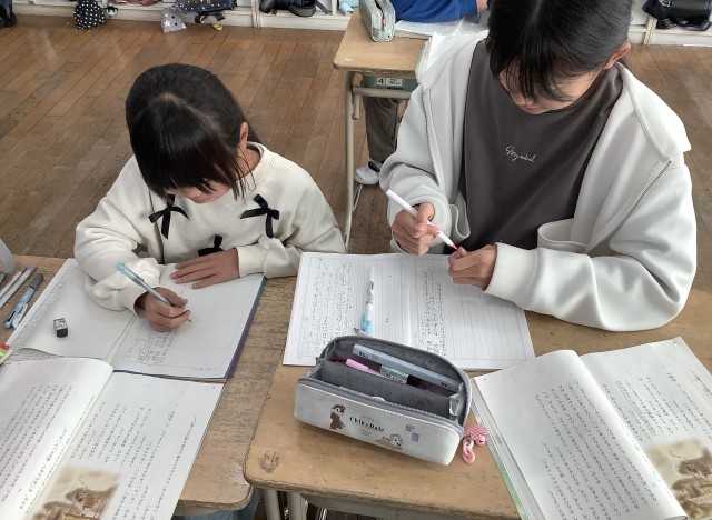 国語でマイプラン学習をしています。『ごんぎつね』を読んだ感想から、自分が追究したい課題を見つけ、計画を立てました。教科書の文章を何度も繰り返し読みながら、表現の意味を考えました。