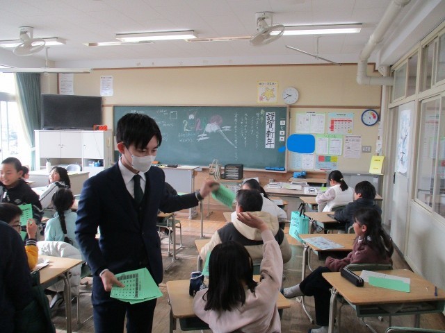 外国語活動の時間に「クリスマス会」をしました。最初にALTの出身地のクリスマスで行う行事の話を聞きました。その後、みんなで楽しめるゲームを2つ行いました。始めに、「カップスゲーム」をしました。リーダーが指示を出すまでカップを取ることができず、どきどきの展開を楽しんでいました。2つ目は、「フィッシュリレー」をしました。2チームに分かれて、扇ぎながら魚を進めて行き、次の人に繋いで行きます。なかなか進まない魚に苦戦していましたが、温かい応援に励まされながら、ゴールすることができました。2学期最後の授業でしたが、とても素敵な時間になりました。
