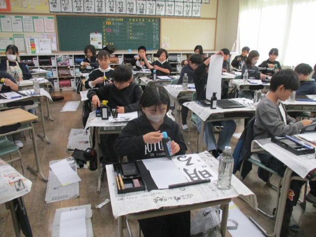 今日は、書き初め会が行われました。授業や冬休みでの練習の成果を発揮するために、書き方のポイントを思い出しながら、一画ずつ丁寧に筆を運んでいました。一人一人が集中し、とても落ち着いた雰囲気で取り組むことができました。