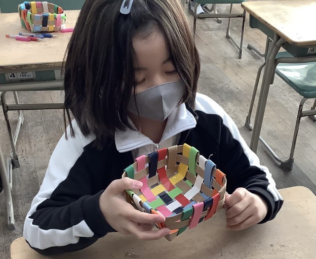 紙のバンドを組み合わせて、入れ物作りをしました。形や大きさ、色の組み合わせ、編み方を工夫しながら、編み込んでいきました。友達の作品を見て、感心する姿も見られました。