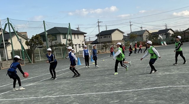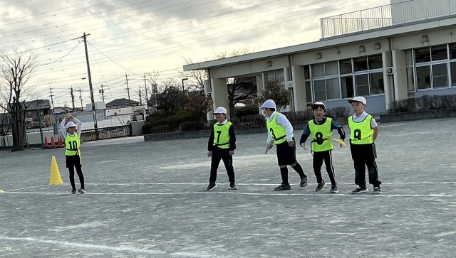 体育で、タグラグビーを行いました。2組と3組のチームで対戦し、どうしたらパスがつながるか、どうしたらトライまでもっていけるかを考えながらゲームを行いました。クラスで応援し、とても盛り上がりました。