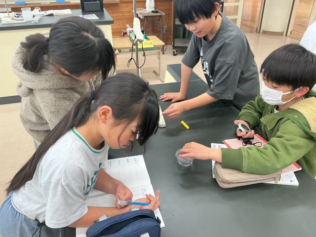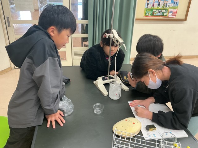 水はどのように温まっていくのかを調べるために、色のついた水を使って実験をしました。青色の水は、温度が上がるとピンク色に変化しました。その色の変化を観察しながら、下から温めても、温めた水は上に行き、上から順に温まっていくことに気づき、驚きの声をあげていました。