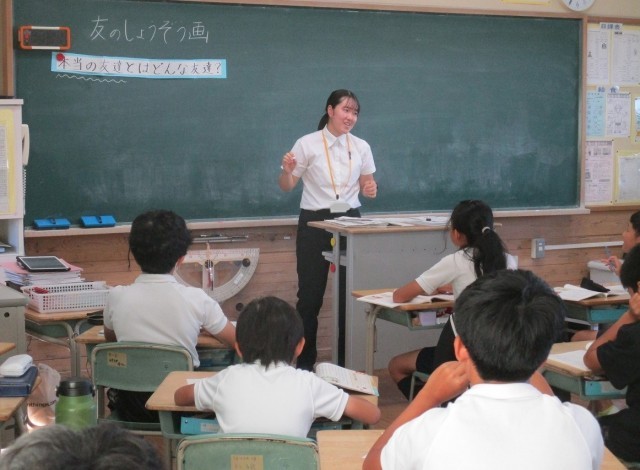 5年2組で、教育実習生による道徳の研究授業が行われました。教材「友のしょうぞう画」を通して、「本当の友達とは、どのような友達か」について考えました。研究授業とあって実習生も初めは緊張気味でしたが、子どもたちの熱心な取り組みにも励まされ、頑張って授業を進めていました。