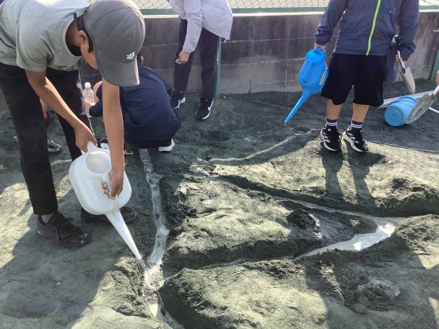 流れる水の場所によって様子が違う秘密を実際に川を作って調べました。流れる水のはたらきが実感できました。