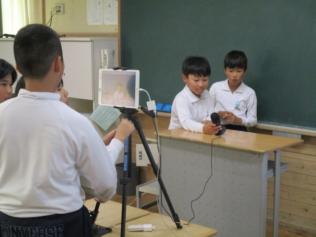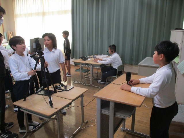 5年生の社会科では、情報についてマイプラン学習で学んでいます。子どもたちが独自に取材した内容をまとめ、校正を重ねた後、実際にニュース番組を作成しています。