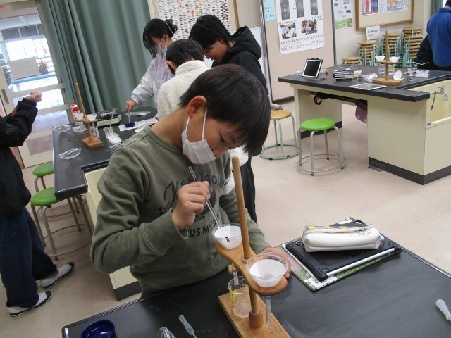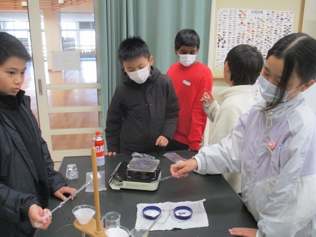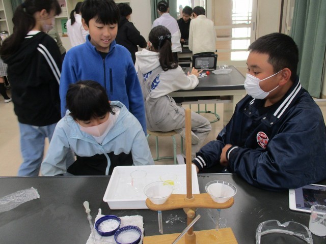 理科「物のとけ方」では、水に溶けた物質の取り出し方について考えています。水に溶けて見えなくなった物質を、再び可視化できるようにするにはどのようにして取り出すとよいのでしょうか。冷やしてみたり、熱してみたりして実験して確かめています。