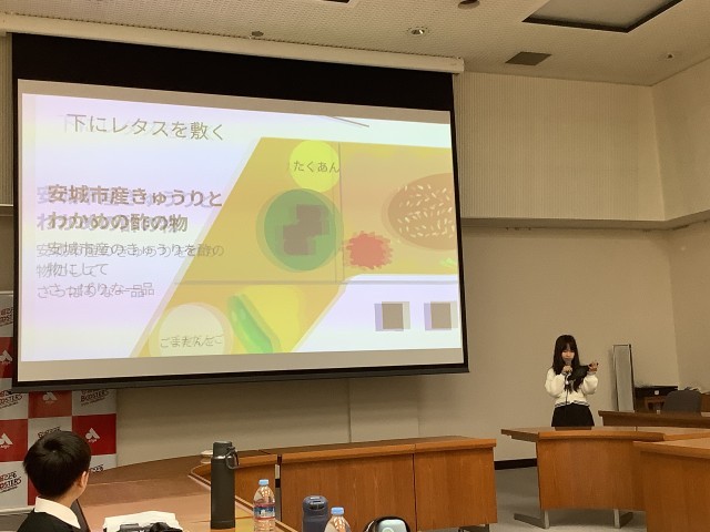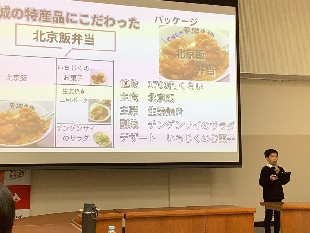 総合的な学習の時間に、三河安城駅オリジナル駅弁を考えています。この日は、各自が考えた駅弁をクラスのみんなの前で発表しました。今まで入手した情報を生かして、どの駅弁もアイデアいっぱいでした。