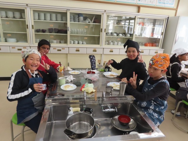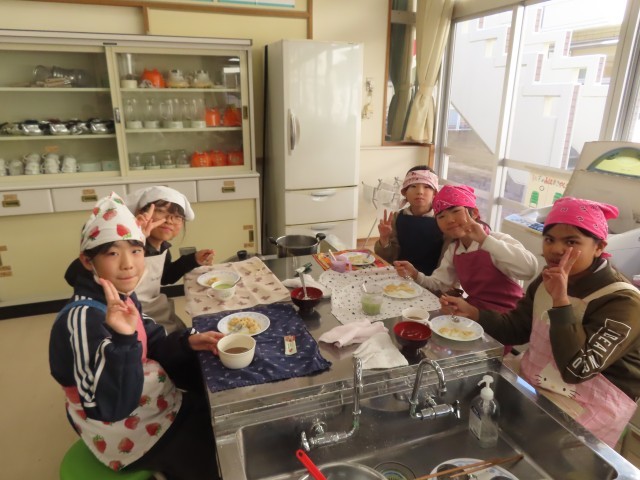 3組も、家庭科の時間でみそ汁を作る実習を行いました。食べやすい大きさに野菜をカットしたり、味が濃くなり過ぎないように自分でみそを調節しながら自分のみそ汁を作りました。食べた時には、「少し味が濃かったかな」「野菜少し硬いな」など、自分で作る難しさを口に出している児童の様子が印象的でした。