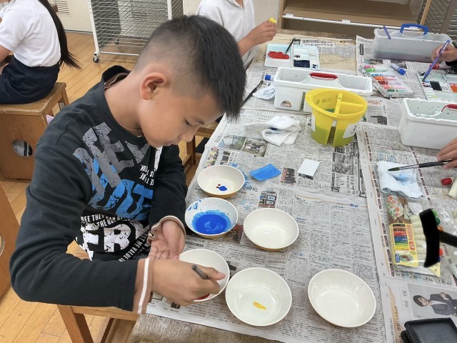 図画工作では、赤、青、黄、白、黒の5色を使って身近にある色と同じ色を作る活動をしました。色を入れ過ぎてしまったり、違う色を入れてしまったりすると思い通りの色にならずに苦戦する姿もありました。だんだんと慣れてくると自分の作りたい色を作れるようになり、一人一人が職人のように集中して取り組んでいました。