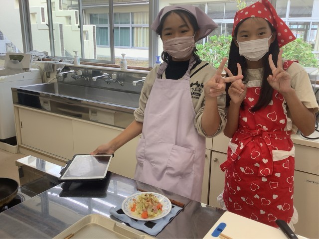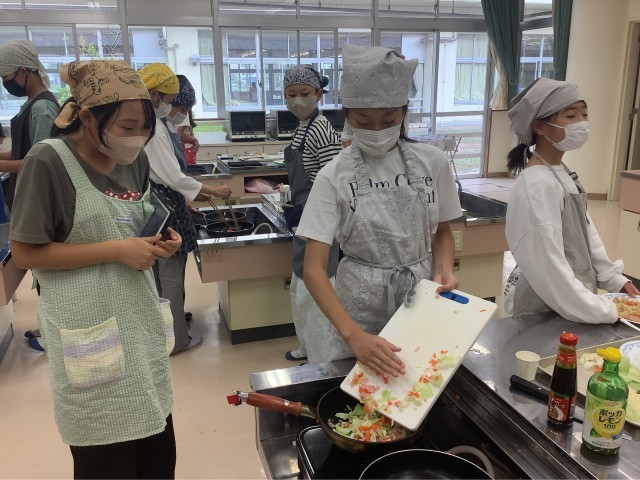 6年生の家庭科の授業では、自分たちで調理の計画を立てて、野菜炒めを作りました。卵やチーズを入れて作った班もあり、オリジナリティあふれる野菜炒めができあがっていました。