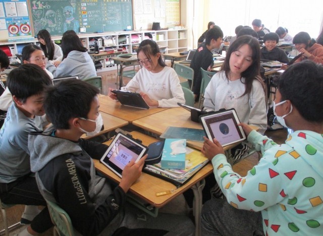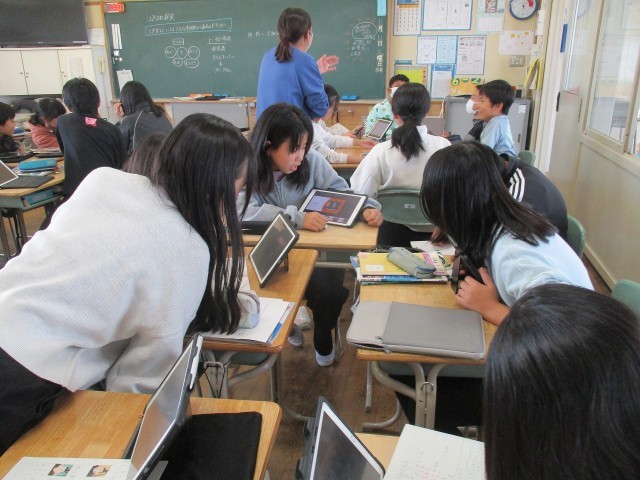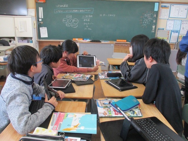 6年生の社会では、これまで江戸時代の文化について調べてきました。今回は、個々が調べたことについて、グループで発表しました。タブレットにまとめたものを見せながら、頑張って伝えていました。