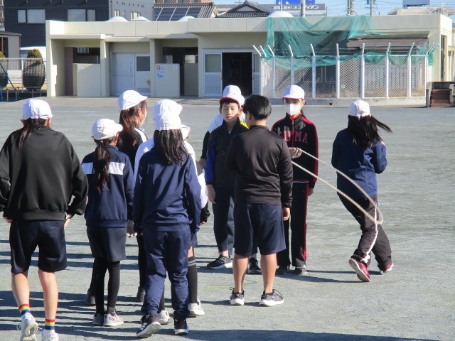体育の時間を使って、長縄跳びの練習をしています。学級内で作戦などを話し合い、学級の記録を伸ばそうと取り組んでいます。縄を回すスピードも、さすが6年生と感じさせるくらいのスピードを器用に跳んでいます。