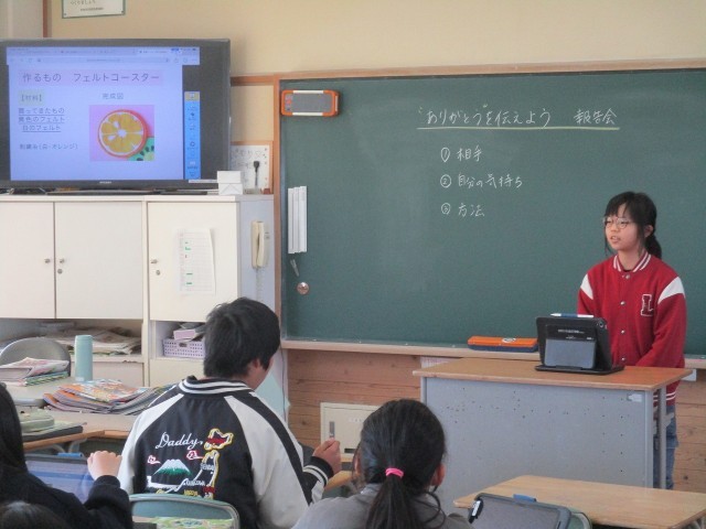 家庭科「ありがとうを伝えよう」の単元で、実際に実践した報告会を行いました。それぞれが「ありがとう」を伝えたい人を考え、気持ちを伝えるために家庭で実践した取組を発表しました。マイタブレットを使って、分かりやすくまとめていました。