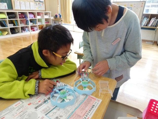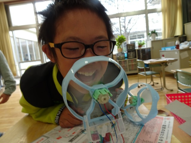電流のはたらきの学習で、扇風機を作りました。ところが、風が来る扇風機と来ないものができてしまいました。二つを比べて違いを探しました。「プラスとマイナスが違うから変えないと。」と見つけることができました。みんな風のあたる扇風機が完成しました。
