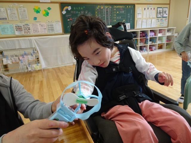 途中で先生の手の上にしゃぼん玉がのりましたが、そのしゃぼん玉は割れませんでした。みんなでなぜ割れないのだろうと考え、手にしゃぼん液が付いているとしゃぼん玉が割れないことに気づきました。その後、実際に自分の手の上にのると歓声を上げ、とても嬉しそうな表情を浮かべていました。