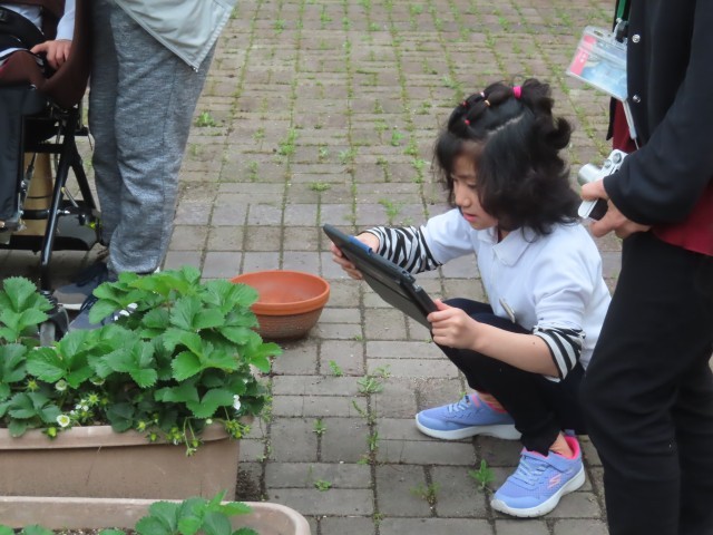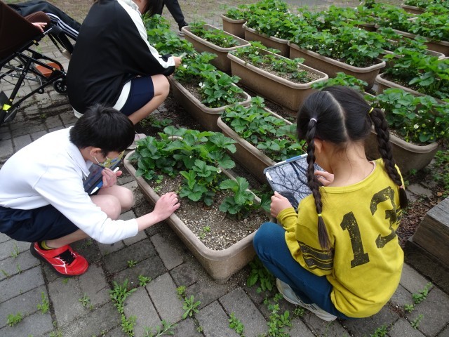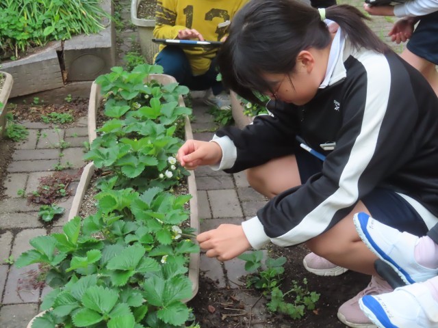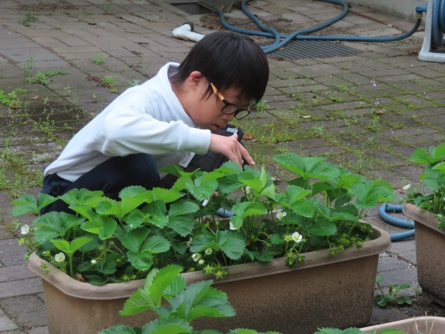 中庭で育てているイチゴの花が咲いたので観察をしました。花の色や形を調べたり、ものさしを使って大きさを調べたりしました。花を探すなかで小さな実ができているのを見つけたときには、「イチゴができている!」と喜ぶ姿もみられました。