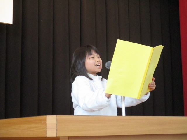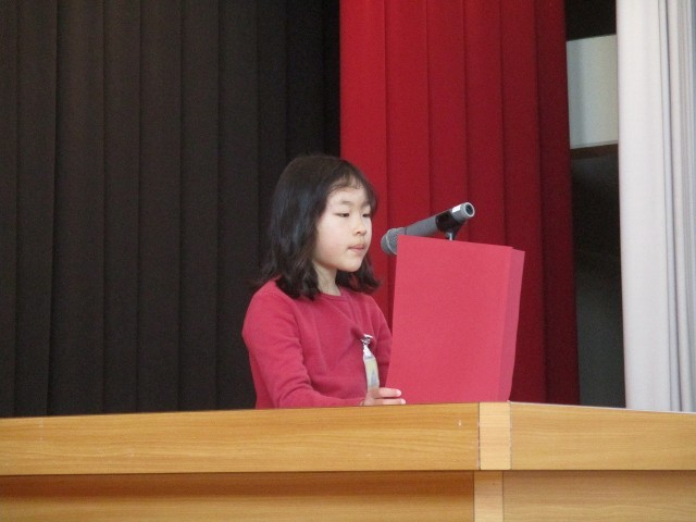 児童代表の言葉では、2名の児童が3学期の抱負と次学年に向けて頑張りたいことを力強く発表しました。