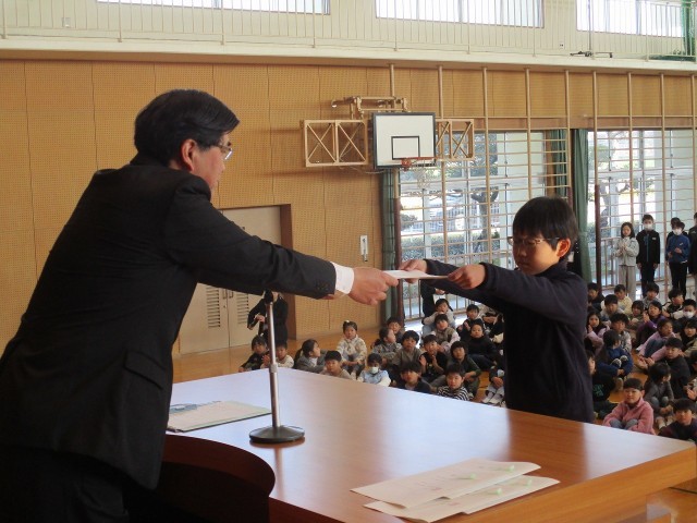 各学年の代表児童へ修了証が渡された後、校長先生からは、「修了証の意味や1つ上の学年に上がる心の準備について」「よい習慣を身につけること」「命を大切にし、自分の命は自分で守ること」「4月からの新しい出会いに向けて」などについてお話がありました。