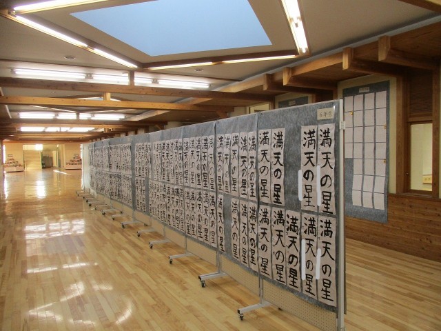 木曜日に行われた校内書き初め会での児童作品が、スマイルギャラリーに展示されています。子どもたちは、自分の作品以外にも友達や他学年の作品にも目を向け、作品を鑑賞する姿が見られています。