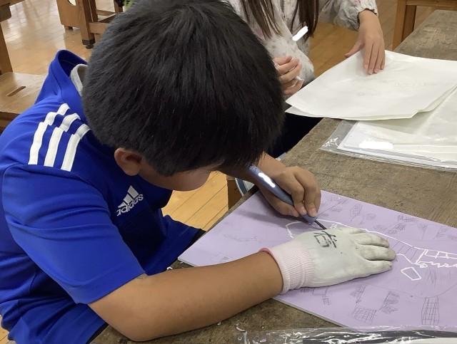 図画工作の時間に版画の制作をしています。今年は、初めて彫刻刀を使ってチャレンジしています。テーマは、「自分の好きな昆虫」です。子どもたちは、下絵の時から丁寧に絵を描いていました。初めての彫刻刀にどきどきしていた子もいましたが、集中して取り組んでいました。