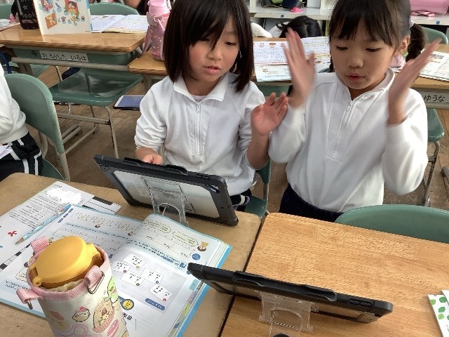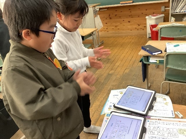 音楽の授業で、タブレットを使って「おまつりの音楽」を作りました。くりかえしの面白さが伝わるように、組み合わせ方を工夫してリズムを作り、友達と伝え合いました。