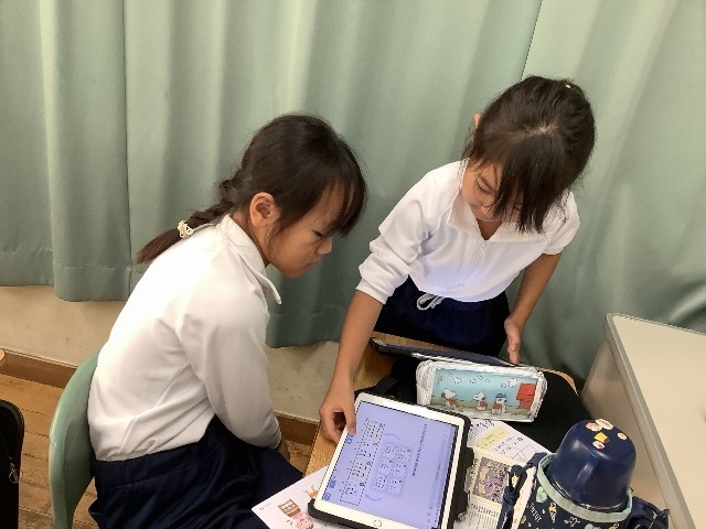 外国語活動の授業では、オリジナルパフェ作りをしました。パフェに入れる果物やアイスクリームの中身を英語で表現したり、友達のパフェに入っているものを聞き合ったりしました。お気に入りの果物を多く入れる子や多くの種類の果物を入れる子など、どれも美味しそうでした。楽しみながら活動することができました。