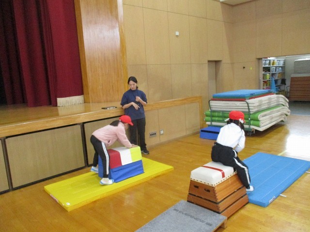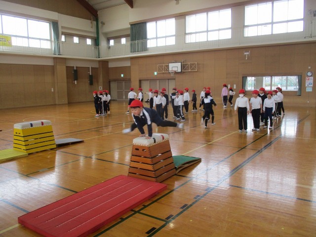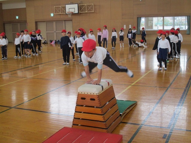 体育では跳び箱に取り組んでいます。子どもたちは、個々で跳び箱の高さや技の難易度を選択し、頑張って練習しています。