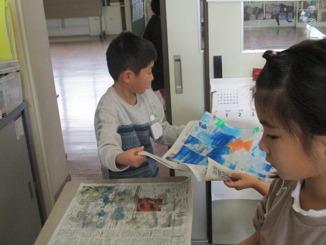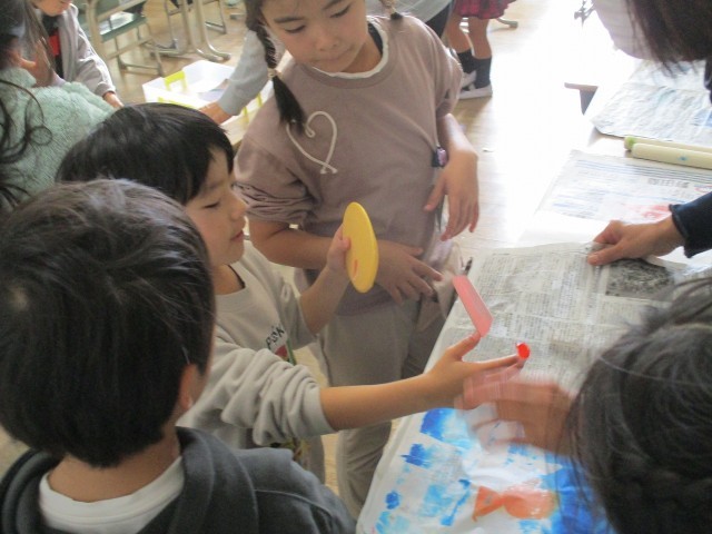 図画工作の時間に版画の制作をしています。製版して乾いた用紙に絵の具で色塗り、きれいに仕上げています。子どもたちは、色とりどりの配色で楽しみながら取り組んでいました。完成間近です。