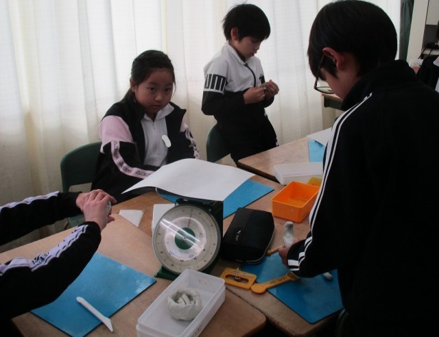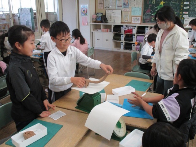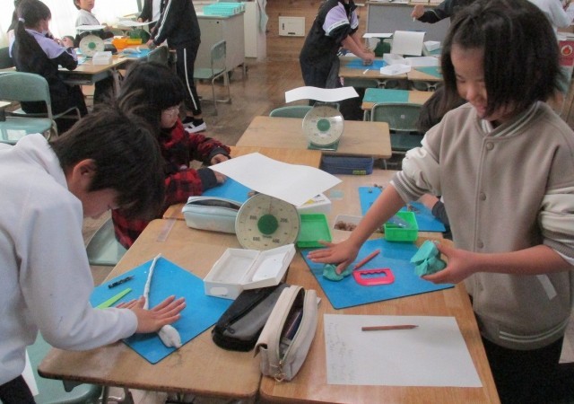 「物の重さ」の単元で、実験に取り組んでいます。同じ量の粘土で、形を様々に変形した場合、重さが変わるのかを実験しています。個々で予想をたて、実験をして検証しています。さあ、結果はどうだったかな?