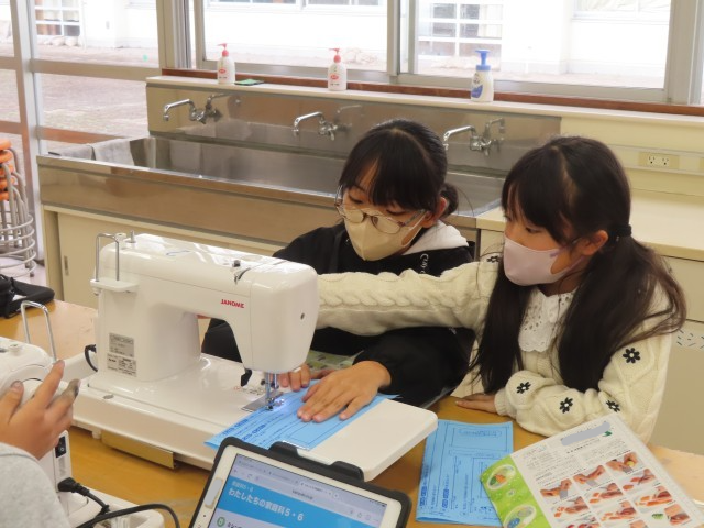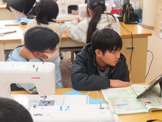 初めてミシンに挑戦しました。ミシンの使い方や縫い方の動画を見て勉強している姿や、友達と協力して一緒に縫い方を学んでいる様子も見られました。ちょっぴり緊張しながら、試し縫いをする姿も印象的でした。