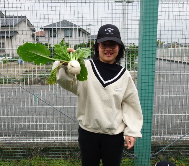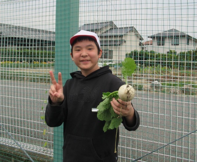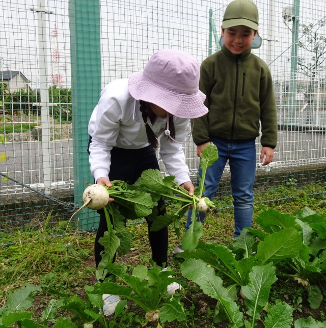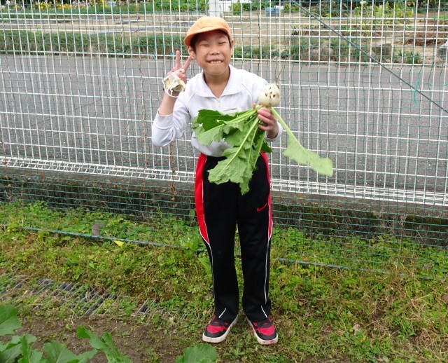 みんなで畑のかぶを収穫しました。大きくなっているものを一生懸命探しました。大きなかぶが収穫でき、とても嬉しそうな表情を浮かべていました。